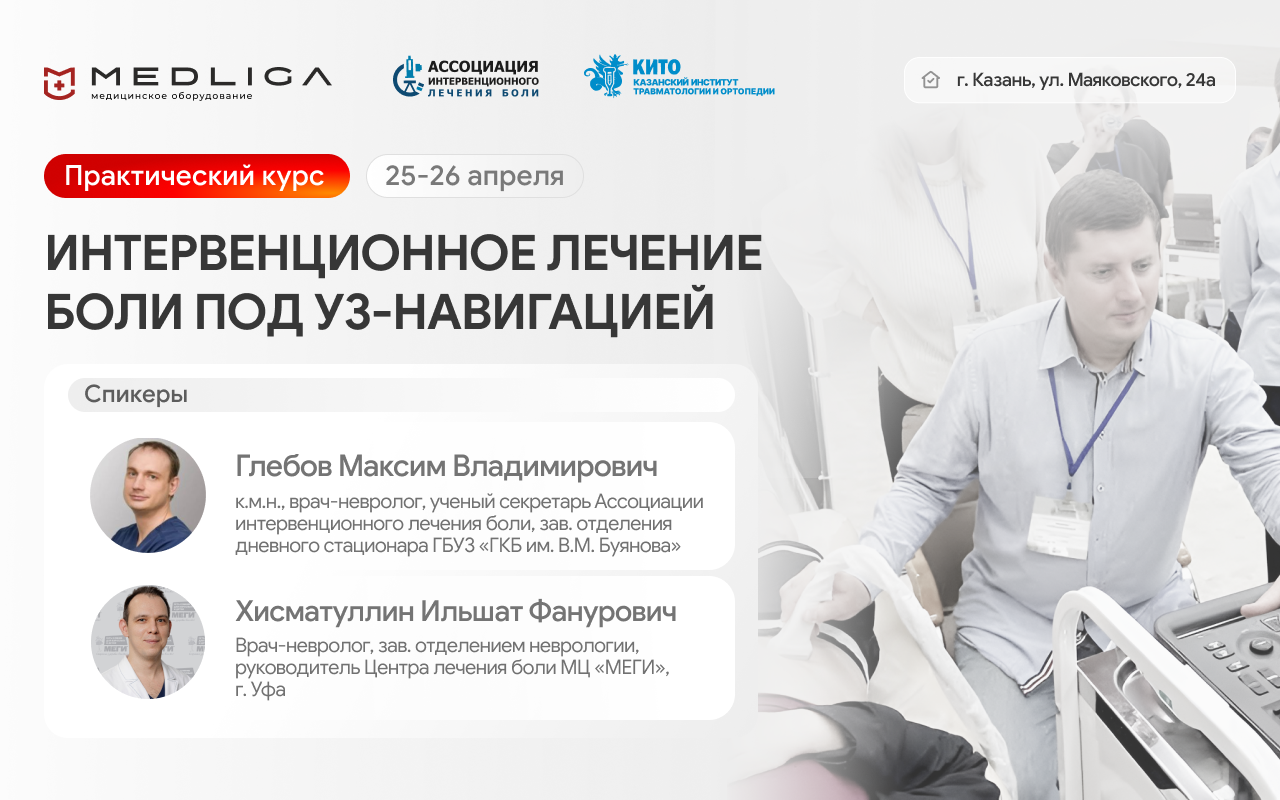 MEDLIGA выступит партнером мероприятия и обеспечит участников оборудованием для УЗ-навигации. Эксперты вместе с участниками пройдут теоретическую базу и интенсивную отработку навыков: будут разобраны основные виды блокад, техники радиочастотной денервации под контролем УЗ-навигации, а также принципы безопасной работы. Практическая часть курса включает работу на фантомах и живых моделях.
