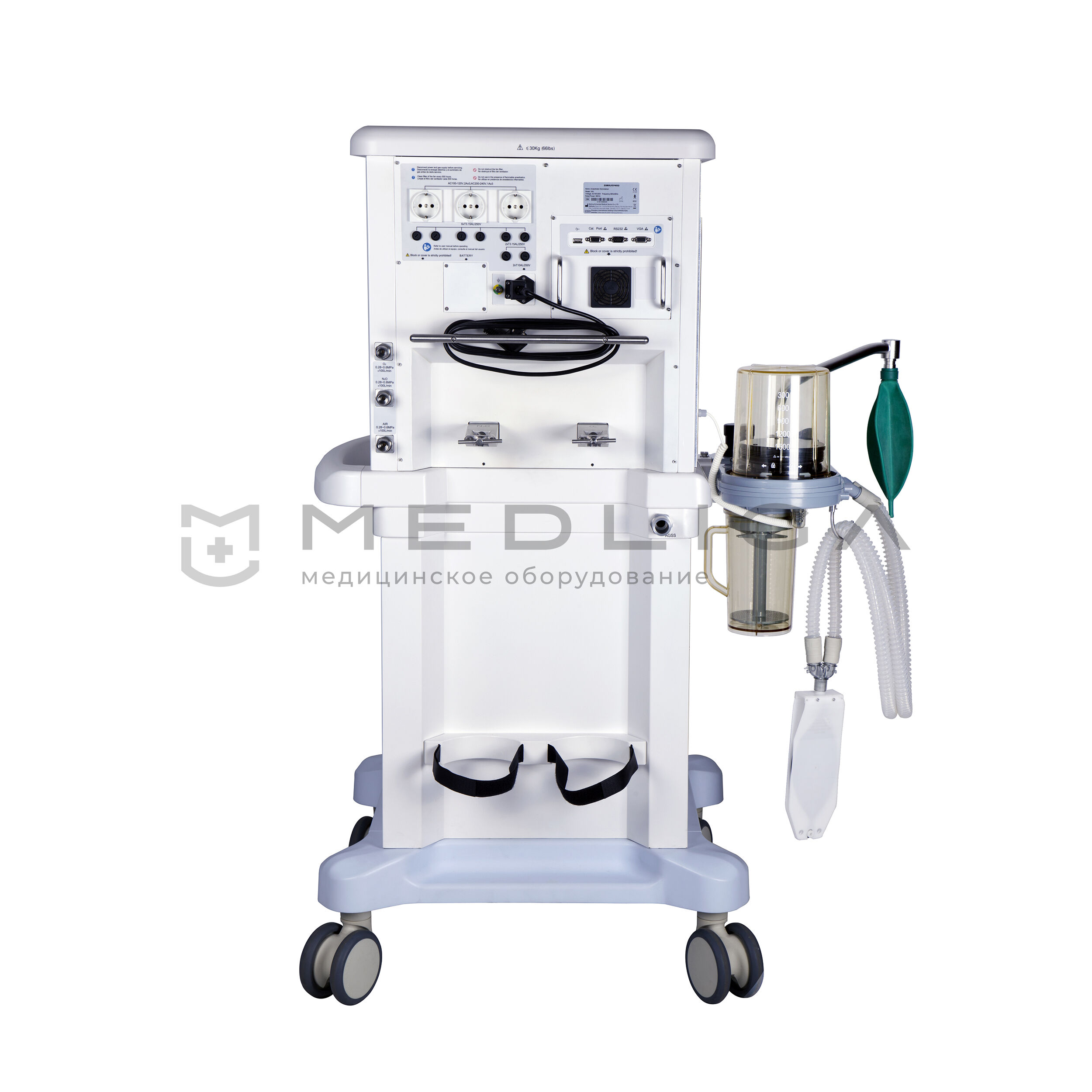 Тележка. Базовая комплектация уже имеет расширенную комплектацию для работы анестезиолога. Трехгазовая версия (О2, AIR, N2O). База на два испарителя Selectatec Interlock. Рельсы с обеих сторон для крепления монитора пациента и ПК. Крепление для двух резервных баллонов О2 и N2O. Три встроенные медицинские розетки 220В для дополнительного оборудования. Светодиодная подсветка рабочего столика и механических ротаметров. Центральный тормоз фиксирует все 4 колеса одной педалью. Подставка для ног врача. Встроенная батарея на 90 минут. Два вместительных выдвижных ящика. Встроенные порты VGA и USB.