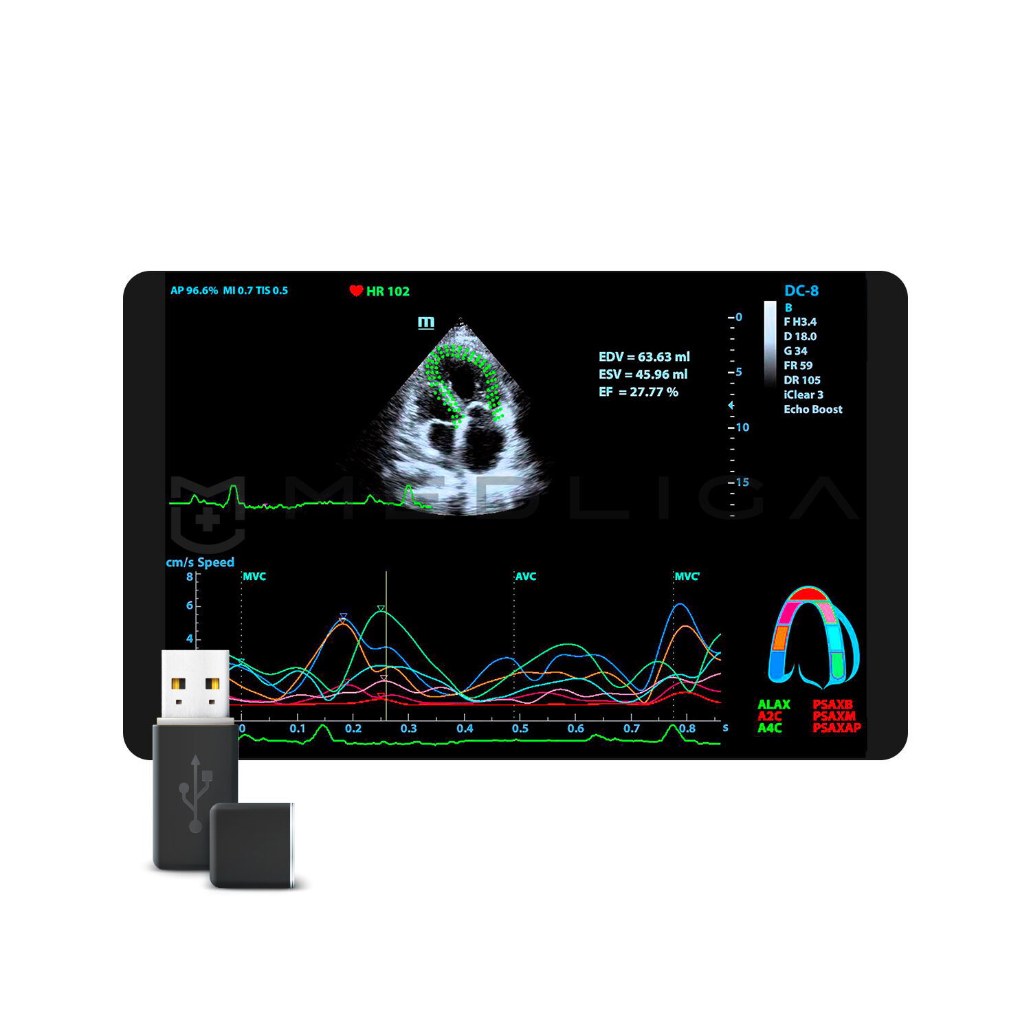 Для эхокардиографии используются секторные фазированные датчики и дополнительные допплеровские режимы с целью исследования сердечной деятельности.