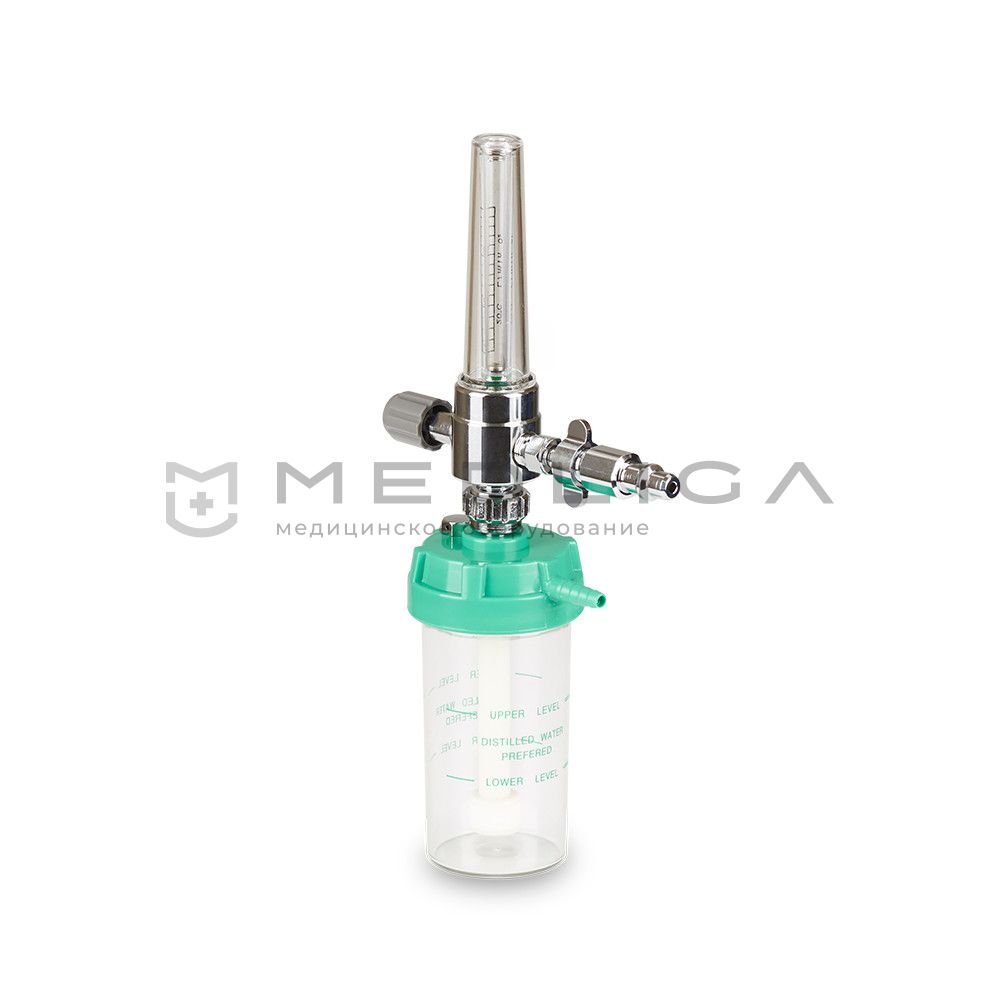 Увлажнитель кислорода оборудован стеклянным ротаметром с металлическим поплавком для определения уровня расхода жидкости. А для контроля потока кислородной смеси имеется механический регулятор.